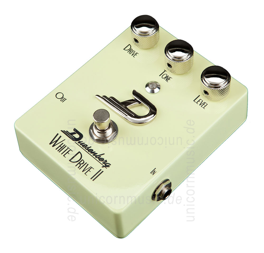 Whether it's a dynamically clean boost, an electrifying crunch or a creamy overdrive - the White Drive II covers the entire bandwidth of necessary boost and overdrive sounds. Thanks to its high dynamics and transparency, the White Drive II sounds just as authentic as an over-modulated tube amp. Versatility of sound makes the White Drive II at home in all musical genres that rely on "vintage" sound - whether it be country, blues or rock. The White Drive II's level of distortion can be controlled to a high degree of accuracy by using the guitar’s own volume controls, and because of its highly effective True Bypass electronics, the White Drive II in its inactivated state remains absolutely sound-neutral. Like all Duesenberg effects, the White Drive II is built to high technological standards, is simple to use and built to withstand wear and tear on the road.